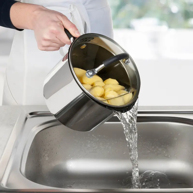 Cette casserole pratique avec système d’égouttage intégré rend toute passoire superflue. Vous égouttez en toute sécurité et sans vous brûler pommes de terre, pâtes et légumes par les trous intégrés dans le bord du couvercle.