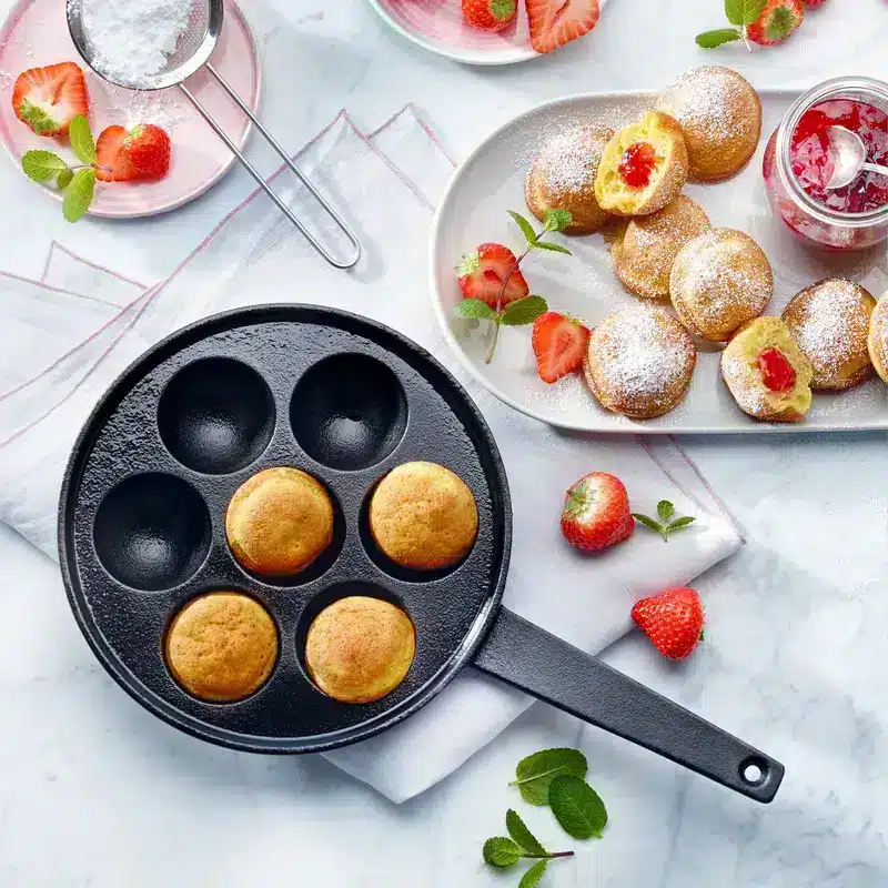 Les délicieux beignets garnis danois à la forme ronde typique se préparent facilement dans cette poêle spéciale. Versez 1 c. à soupe de pâte à Æbleskiver (ou pâte à gaufre), dans les creux graissés de la poêle préchauffée.