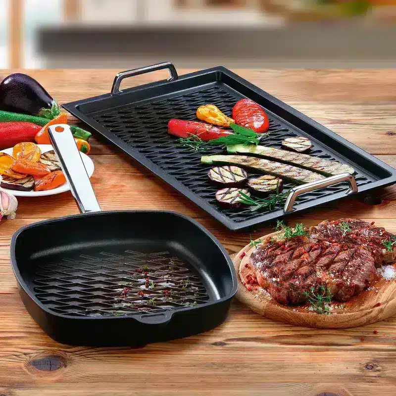 Si vous appréciez les aliments bien dorés, vous ne pouvez pas vous passer d’une poêle de première qualité en fonte ou en fer forgé. Bien entretenu, cet ustensile de cuisine vous accompagnera toute votre vie. Un bon complément serait une poêle multicouche de haute qualité. Elle combine les propriétés positives de différents métaux avec le revêtement antiadhésif et permet une cuisson sans problème, évitant aux aliments de coller. Selon vos préférences culinaires, vous pouvez compléter cet équipement de base par diverses poêles spécialisées, par exemple un gril.