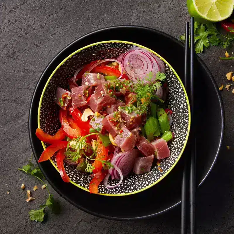 Jetzt ansehenErleben Sie das pure karibische Feeling mit unserer Ceviche-Poké Bowl! Mit frischem, zartem Thunfisch in Sushi-Qualität und einer knackigen Mischung aus Paprika, Zwiebel, Tomate und Bleichsellerie ist jeder Biss ein echter Hochgenuss. Abgerundet wird das Gericht mit der Schärfe aus roter Chilischote und dem frischen Aroma von Koriander, während Limetten dem Thunfisch den letzten Schliff verleihen. Probieren Sie jetzt die Kombination aus dem Besten aus beiden Welten – feurig-frisch und unglaublich lecker! | ZUM REZEPT – HIER KLICKEN |