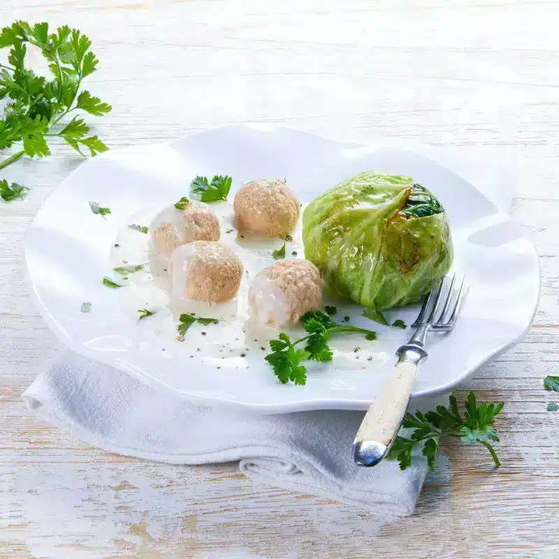 Lassen Sie sich von einem unwiderstehlichen Low Carb-Gericht verführen: Poularden Klößchen auf Weißweinsauce, serviert mit würzigen Wirsingbällchen! Dieses Rezept ist der Beweis, dass man auch bei einer Low Carb-Diät nicht auf Geschmack und Abwechslung verzichten muss. Die Wirsingbällchen sind eine perfekte Kombination aus saftigem Gemüse und sämiger Crème fraîche, während die Poularden Klößchen in einer herrlich cremigen Weißweinsauce serviert werden. Verfeinern Sie das Gericht mit einem Hauch frischer Petersilie und erleben Sie ein unvergessliches Geschmackserlebnis! | ZUM REZEPT – HIER KLICKEN |