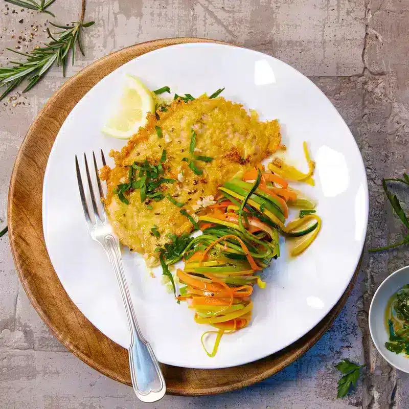 Erleben Sie das ultimative kulinarische Abenteuer mit unserem Low Carb Schweineschnitzel in Parmesankruste, begleitet von leckeren Gemüsenudeln und einer köstlichen Gremolata. Die Schnitzel werden flach geklopft und in einer Parmesan-Rosmarin-Panade gebacken, die jeden Bissen zu einem unvergesslichen Erlebnis macht. Die Gemüsenudeln aus Möhren, Zucchini und Porree werden mit geschmolzener Butter und Salz und Pfeffer zu einem perfekten Begleiter für das Schnitzel. Die Gremolata aus Zitrone, Knoblauch, Petersilie und Olivenöl rundet das Gericht perfekt ab und verleiht ihm einen frischen Geschmack. Probieren Sie jetzt unser Low Carb Schweineschnitzel-Rezept und gönnen Sie sich ein köstliches kulinarisches Abenteuer! | ZUM REZEPT – HIER KLICKEN |