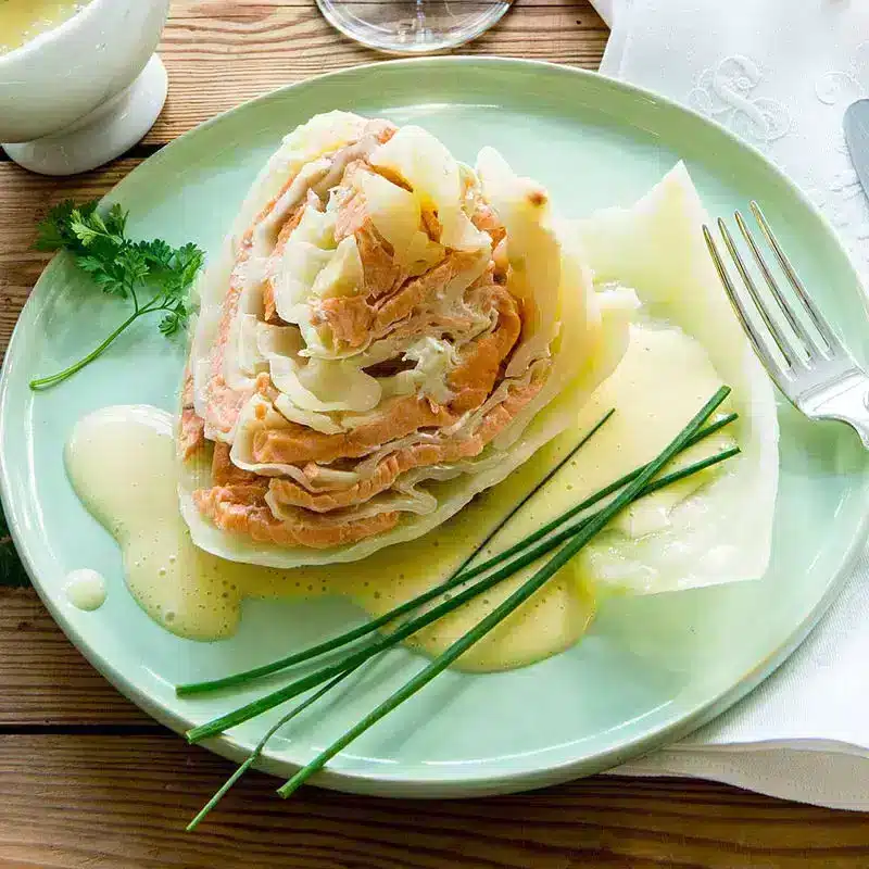 Verwöhnen Sie Ihre Familie und Freunde mit dem köstlichen Rezept Weißkohl mit Lachsfüllung. Dieses Gericht besteht aus einem zarten Weißkohl, gefüllt mit feinem Lachsfilet, und einer cremigen Noilly Prat Buttersauce. Um einen besonderen Geschmack zu erhalten, wird der Weißkohl im Pochierfond gekocht. Mit seinen frischen Zutaten, wie Zitrone, Karotte, Zwiebel und Knoblauch, wird der Pochierfond zum wichtigsten Bestandteil des Gerichts. Die Noilly Prat Buttersauce rundet das Aroma perfekt ab und ist einfach in der Zubereitung. Mit einer Prise Kerbel oder Petersilie wird das Gericht zum absoluten Hingucker auf dem Tisch. Überraschen Sie Ihre Gäste mit diesem wunderbaren Rezept! | ZUM REZEPT – HIER KLICKEN |