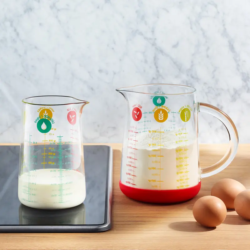 L’anneau en silicone amovible assure une bonne stabilité. Grâce au verre résistant aux rayures, vous travaillez avec un fouet ou un mixeur directement dans le pichet gradué. Sans anneau en silicone, vous pouvez y réchauffer des liquides au micro-ondes ou sur une cuisinière électrique (sans induction).