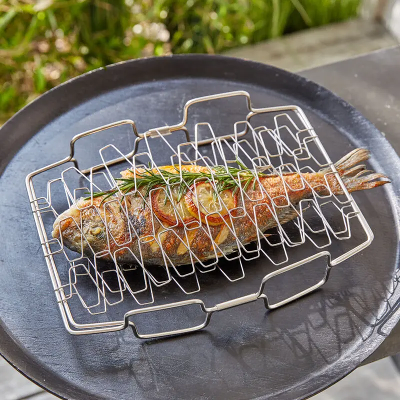 Tout ce qui est particulièrement tendre, se désagrégeant facilement ou brûlant rapidement, est parfaitement grillé dans ce grand panier en acier inoxydable. Grâce aux grandes poignées, vous retournerez ainsi retourner les aliments à temps et en toute sécurité.