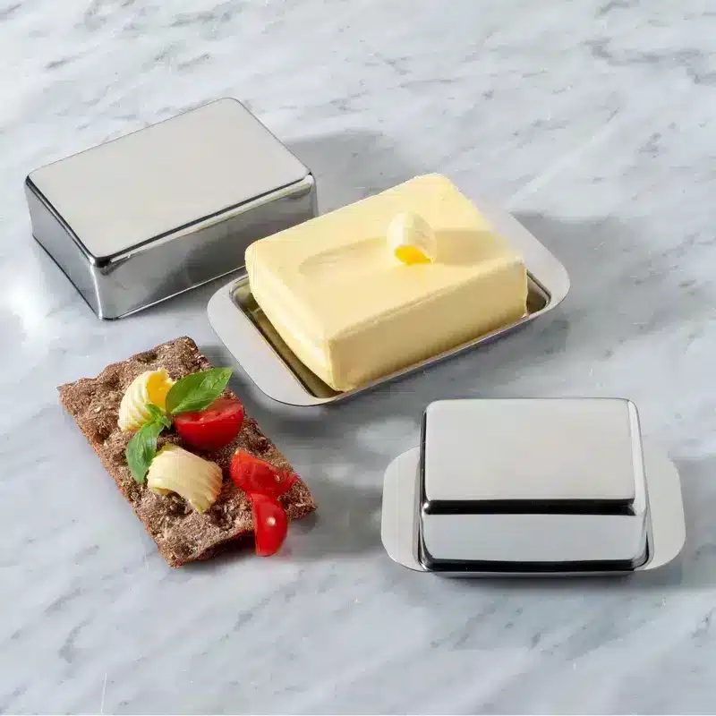 Qu’il s’agisse du beurrier de 125 g ou de 250 g, ils se rangent sans problème dans les compartiments à beurre standard du réfrigérateur. Sous le couvercle hermétique du beurrier peu encombrant et incassable, le beurre reste toujours facile à tartiner, parfaitement propre, appétissant, frais et exempt d’odeurs étrangères.