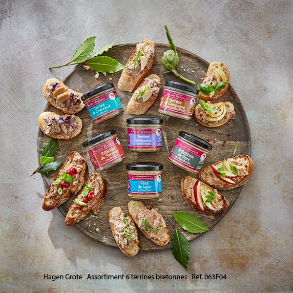 Même si le poisson et les fruits de mer sont emblématiques de la cuisine bretonne, des spécialités de viande sont appréciées. La viande d’agneau de pré-salé (pâturage situé en bord de mer dans la baie du Mont Saint-Michel) est considérée comme un produit fin, servi en particulier lors d’occasions spéciales. Les charcuteries populaires incluent les rillettes, le saucisson sec, l’andouille fumée ainsi que le boudin noir et les tripes. Les pâtés de campagne rustiques ou raffinés, préparés par exemple avec du foie de canard ou de porc et des champignons, font aussi partie des délices bretons. Un des plats de viande les plus célèbres en Bretagne est le pot-au-feu breton (Kig-ha farz). Autrefois plat des pauvres, ce plat rustique est aujourd’hui redécouvert dans toutes les classes sociales. Il est composé de différentes viandes, comme le lard et le bœuf, de légumes comme le poireau et l’oignon, ainsi que de pommes de terre et de farine de sarrasin. Le plat est traditionnellement agrémenté de beurre salé typique de la Bretagne. La Bretagne est également reconnue pour sa grande variété de terrines délicieuses, comme en témoigne notre assortiment de 6 terrines, produites dans les Côtes-d’Armor de manière artisanale selon des recettes traditionnelles. La meilleure viande d’élevage régional et le gibier forment leur base. Que ce soit la terrine de porc aux artichauts, la terrine de châtaignes au cerf, les rillettes de porc au cidre, le pâté de lapin, la terrine de porc à l’oignon de Roscoff ou les rillettes de sanglier aux airelles : sur de la baguette de campagne fraîche, les six variantes sont un régal unique.
