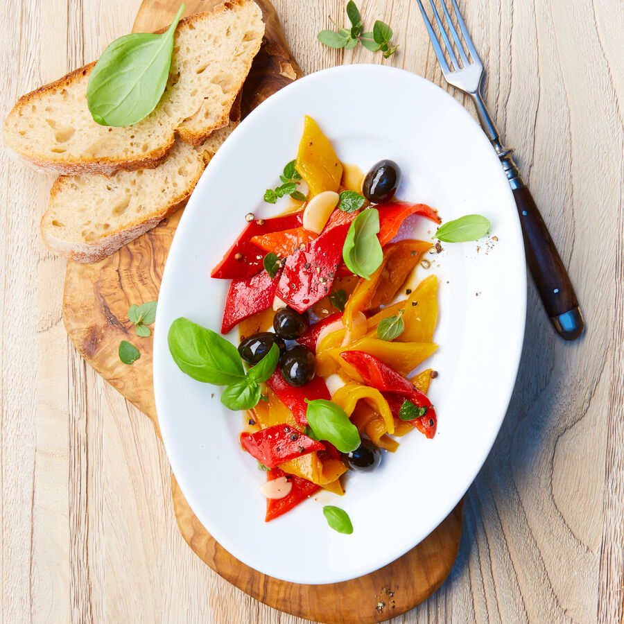 Servir à température ambiante (si les poivrons préparés ont été placés au réfrigérateur, les sortir à l'avance). Disposer sur des assiettes à hors-d'oeuvre. Garnir d'olives noires et de feuilles de basilic. Servir avec du pain italien rustique.