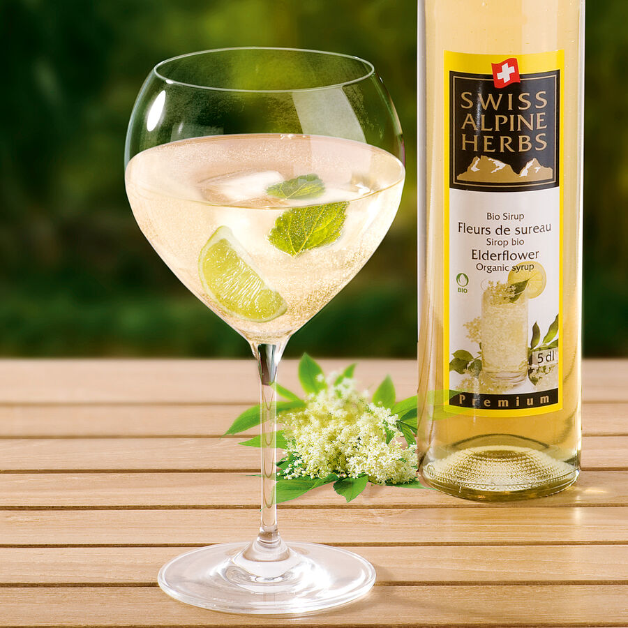 Coupez le citron vert en quatre et en mettre 1 morceau dans un verre. Pressez les 3 autres et versez le jus obtenu dans le verre. Ajoutez le sirop de fleurs de sureau, les petites feuilles de menthe et les glaçons et complétez avec le prosecco et l'eau minérale.