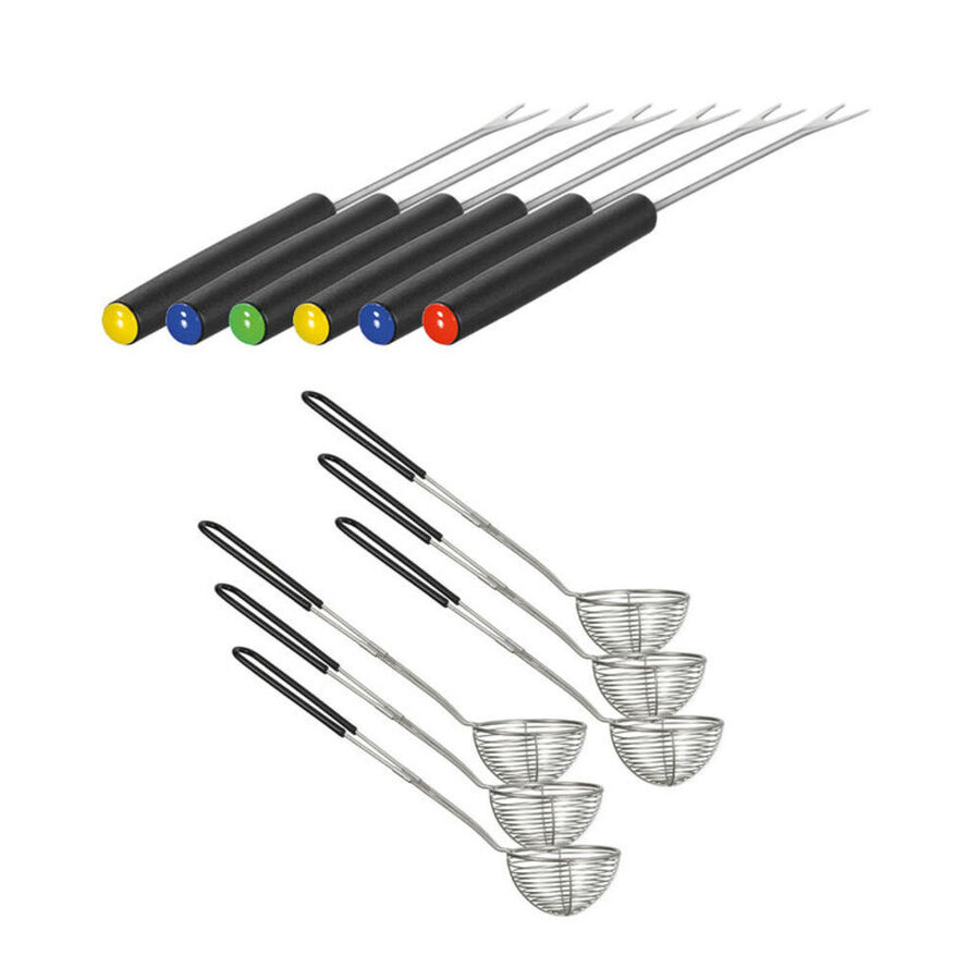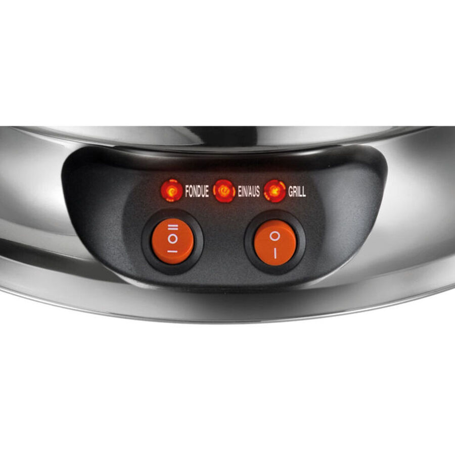 Caquelon en acier inoxydable brossé, Ø 33 cm, capacité 4 l, dimensions totales avec couvercle 41,5 x 32,5 x 22 cm (l/p/h), poids 4,5 kg, grille Ø 17,5 cm, couvercle en verre, élément chauffant en acier inoxydable, pieds en caoutchouc antidérapant, 230V/1950W, câble 95 cm, 6 paniers métalliques, 6 fourchettes à fondue.