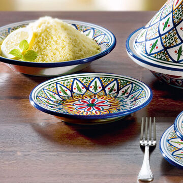 Wassim Charada fabrique dans sa manufacture tunisienne cette vaisselle d'art de qualité. Baptisée en hommage à la belle ville côtière Tabarka, celle-ci, ouverte aux influences européennes de ses voisins, comme la France et l'Italie, est très riche culturellement. Les ornementations et décors d'influence islamique sont réalisés à partir de couleurs vives sur fond blanc. Entièrement peinte à la main, chaque élément de vaisselle est un objet unique. Cette vaisselle d'art, avec ses formes et couleurs d'inspiration orientale, offrent un merveilleux cadre pour tous vos plats et pas seulement pour vos plats exotiques. Céramique, cuite 2 fois, à plus de 1.000, lavable au lave-vaisselle, utilisable au micro-onde. Le moule à tajine ne résiste pas au four et est utilisable uniquement pour le service.