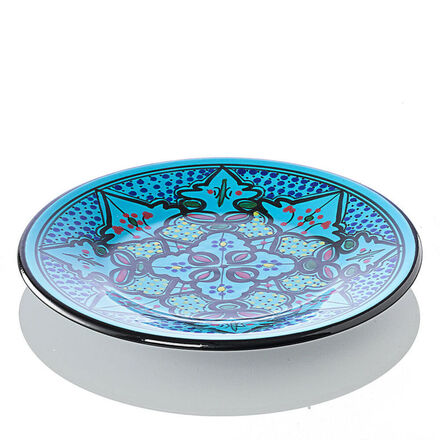 Le décor sophistiqué est appliqué á la main dans une petite manufacture tunisienne. La couleur turquoise rappelle la Méditerranée. Chaque pièce est unique. Ces petits chefs d'oeuvre offrent un cadre exclusif d'inspiration orientale avec leurs couleurs intenses mais pas seulement pour les plats exotiques. Céramique dure, cuite 2 fois à plus de 1.000 °C, passe au lave-vaisselle et au micro-ondes. Le tajine ne va pas au four et ne doit être utilisé que pour le service.