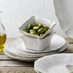 L'olivier a toujours été un symbole particulier de l'univers culinaire de la région méditerranéenne. Ses feuilles et ses fruits ornent le bord, délicatement travaillé en relief, de cette vaisselle très classe. Avec une élégance charmante, elle transmet un style de vie de haut niveau. Les bords de la vaisselle ont été traités au cours d'un travail manuel sophistiqué pour obtenir le bel effet patiné. La cuisson à presque 1200 °C rend la vaisselle en faïence haut de gamme, recouverte d'un verni pour contact alimentaire, résistante à une température de -20 °C à + 250 °C, adaptée au micro-ondes et au lave-vaisselle.