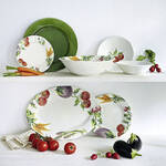 Pour cette vaisselle, notre designer s'est laissé inspirer par la variété des jardins potagers italiens. Tomates mûres, carottes et radis aux coloris lumineux, asperges vertes et aubergines au ton violet profond sont soigneusement représentés. Disposés sur le bord des assiettes, ils forment un cadre original et coloré pour vos repas. Le fond de l'assiette creuse, lui, est orné de tomates appétissantes. Ceci contraste agréablement avec l'assiette de présentation vert uni. Céramique cuite et émaillée à 1000 °C, résistante aux rayures. Va au micro-ondes et au lave-vaisselle.