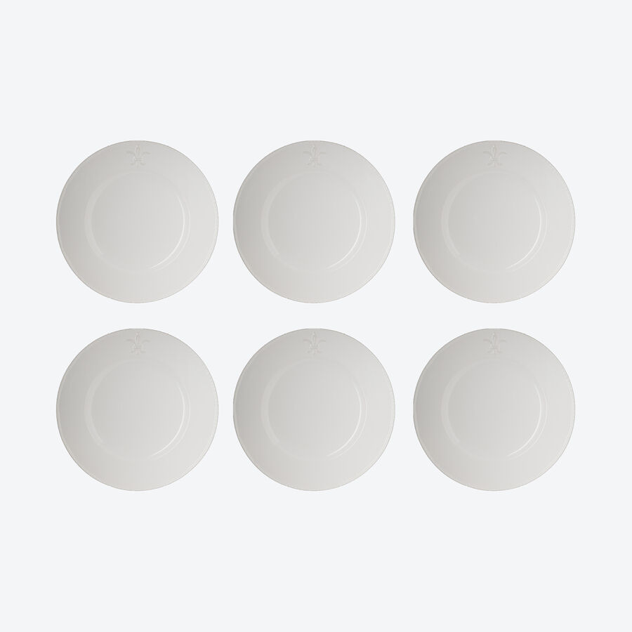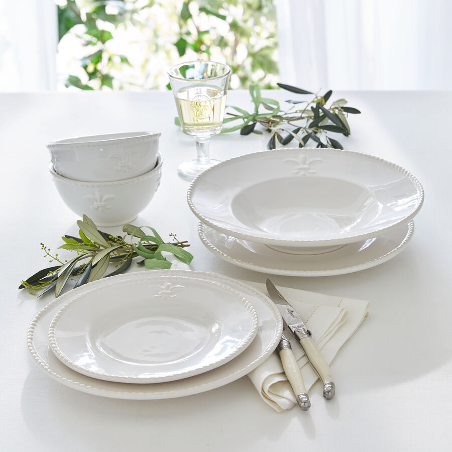 La bonne cuisine s'accompagne d'une belle vaisselle. Depuis le 12ème siècle, le lys représente l'aristocratie française. Il est le symbole de l'art de vivre royal. Une fleur de lys héraldique légèrement en relief ainsi qu'un bord torsadé ornent cette vaisselle en faïence. Les mets seront joliment présentés, leur qualité culinaire mise en valeur. Quotidiennement ou lors des occasions de fête, la sobre élégance émanant de ces plats et assiettes vous offrira un plaisir subtil. Faïence blanche, va au micro-ondes et au lave-vaisselle.