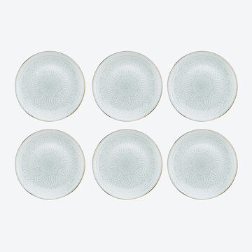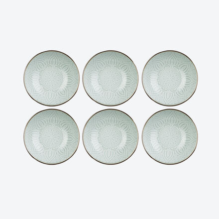 Cette vaisselle de qualité a été conçue dans un style oriental classique et intemporel. Le ton crème rappelle le sable du Sahara, le vert délicat le célèbre lac Solaire scintillant, Birkat ash-Shams, en Égypte. Les ornements féériques sont apposés en relief, le bord est pulvérisé après l'émaillage. Il n'y a pas que les plats ou salades typiquement arabes qui trouveront un cadre exclusif dans ces assiettes d'inspiration orientale.