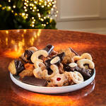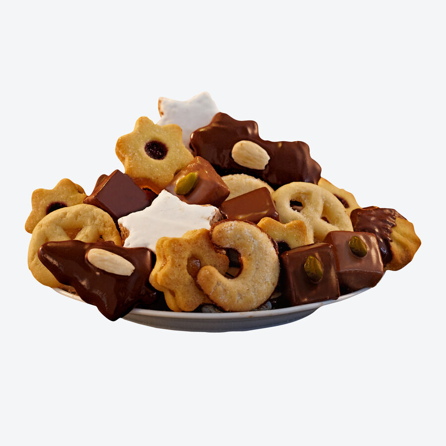 Ingrédients : Farine de blé, beurre, sucre, massepain (amandes, sucre, eau, sirop de sucre inverti, humectant (sirop de sorbitol), éthanol), sucre glace, enrobage de chocolat noir 60 % de cacao (pâte de cacao, sucre, beurre de cacao, émulsifiant (lécithines de soja), extrait de vanille), amandes, noisettes, lait entier de couverture 38 % de cacao (sucre, beurre de cacao, poudre de lait entier, pâte de cacao, émulsifiant (lécithines de soja), extrait de vanille), farine de pommes de terre, miel, beurre clarifié (beurre clarifié, colorant (bêta-carotène)), pistaches, fourrage aux pommes (pommes, sucre, sirop de glucose-fructose, concentré de jus de pomme, gélifiant (pectine), acidifiant (acide citrique), colorant alimentaire (concentré de citron, concentré de fleur de carthame), cannelle, arôme), farine de seigle, crème de sucre inverti (sucre inverti issu du saccharose, sirop de glucose issu du blé, miel), margarine (graisse végétale de beurre de karité, eau, graisse végétale de graisse de coco, huile végétale de tournesol, concentré de citron, sel), confiture de griottes (purée de griottes, sucre, sirop de glucose-fructose, concentré de jus de citron, gélifiant (pectines)), arôme naturel, pâte de massepain (amandes, sucre, eau, sirop de sucre inverti), farine de blé maltée, oeuf entier, noisettes grillées, sel, cannelle, poudre de blanc d'oeuf, crème fouettée (crème fouettée, épaississant (carraghénane)), épices pour pain d'épices (coriandre, cannelle, clous de girofle, anis, arôme naturel), gousses de vanille.