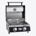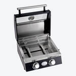 Deux brûleurs haute performance en acier inoxydable de 2,2 kW, commutables et réglables individuellement, chauffent avec précision et jusqu'à 300 °C la grande surface de cuisson principale avec sa grille de cuisson en deux parties en acier inoxydable. La grille de maintien au chaud en acier inoxydable pratique crée une surface de cuisson supplémentaire. Grâce au couvercle à double paroi avec insert en verre et thermomètre intégré (30 à 350 °C), vous surveillez la cuisson sans perte de chaleur. Utilisable comme gril de table ou sur pied. Avec support, hauteur de travail de 90 cm ménageant le dos. Fonctionnement sûr grâce au régulateur de pression de gaz avec sécurité anti-rupture tuyau intégrée.