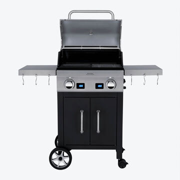 Les zones de chauffe indépendantes permettent d'utiliser les deux plaques de cuisson en fonte d'acier émaillée séparément ou simultanément. Température réglable en continu jusqu'à 300 °C, bac de récupération des graisses avec tiroir collecteur, plaques amovibles pour un nettoyage facile. Monté sur roulettes fluides avec frein, il offre de larges espaces de rangement et une étagère intégrée. Le meuble inférieur est à assembler.Châssis en acier inoxydable, dimensions 122,5 x 51 x 115 cm (l/p/h), tablettes latérales de 32 x 38,5 cm, poids 25,5 kg, surface de cuisson totale 54 x 32 cm. Équipé d'un écran d'affichage, alimentation 230V/2 800W, câble de 2 m, sécurité testée.