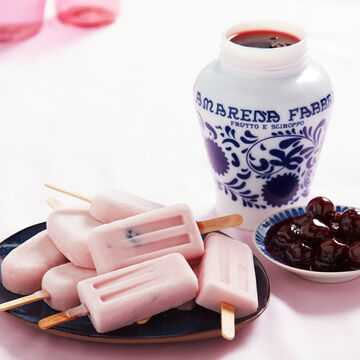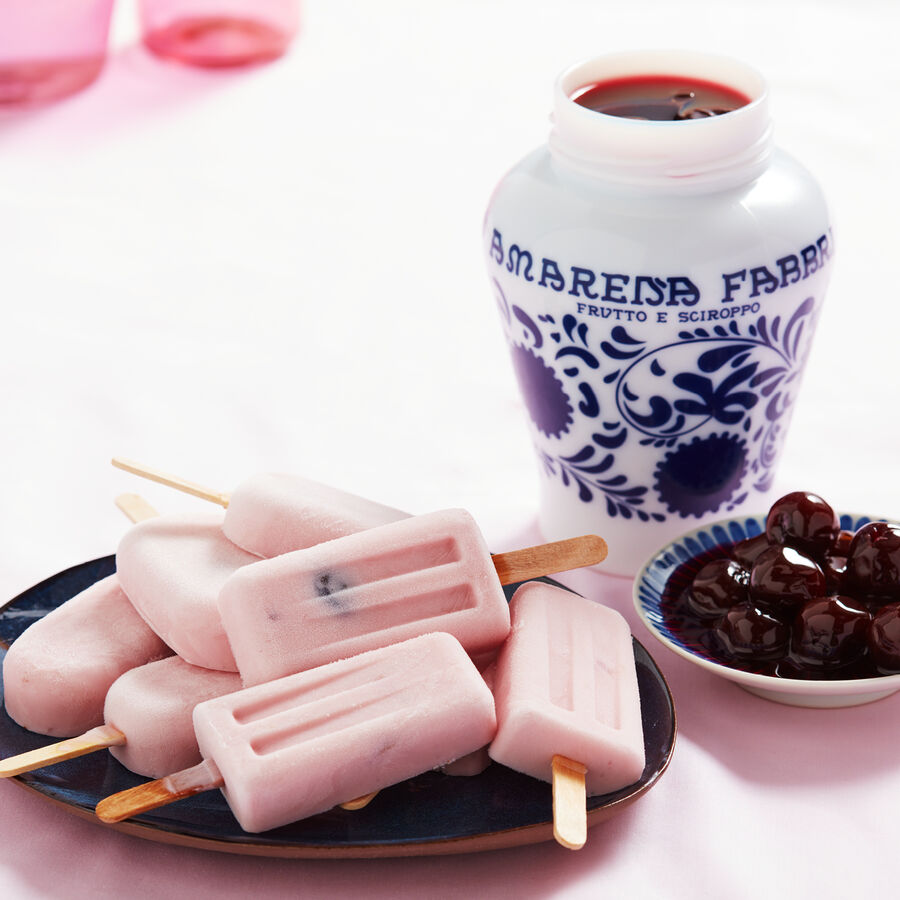 1 Mélanger le yaourt avec le lait et le sirop d'amarena (ajouter la quantité nécessaire pour atteindre la couleur voulue). Ajouter quelques cerises amarena grossièrement hachées et remuer.