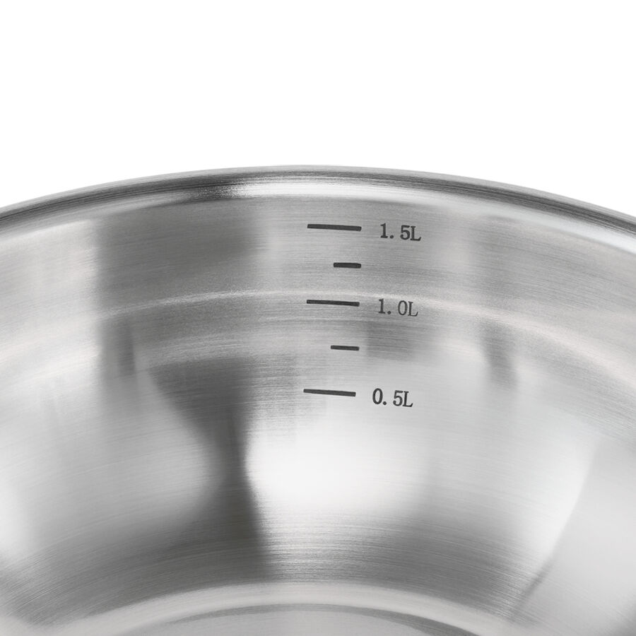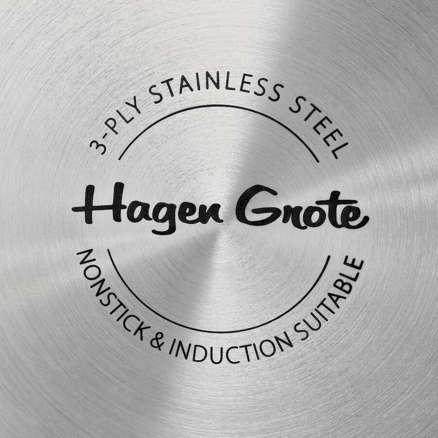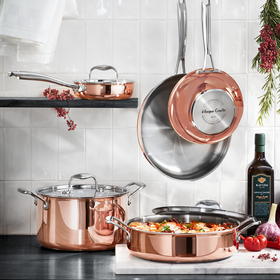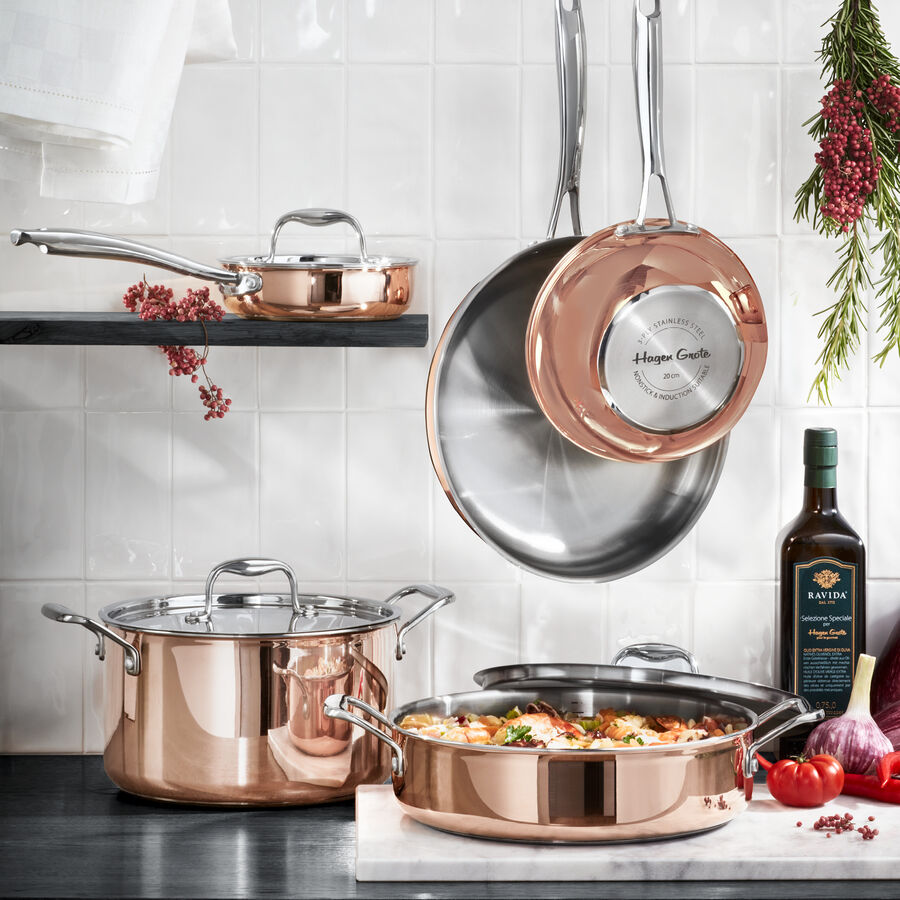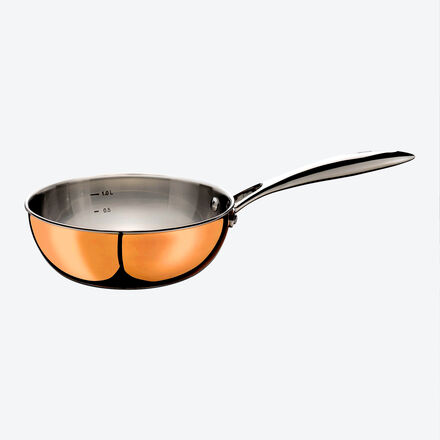 Qu'il s'agisse d'une cuisinière à gaz, électrique ou à induction, le cuivre dispose de la plus grande conductivité thermique et de la plus grande capacité d'accumulation. Grâce aux fonds spéciaux magnétiques en acier inoxydable, vous économisez en outre du temps et de l'énergie lors du processus de cuisson. La chaleur est répartie de manière absolument uniforme du fond au couvercle grâce à l'épaisseur totale considérable de la paroi de 2,8 mm et à la structure en 5 couches (couche intérieure en acier inoxydable, suivie de couches d'aluminium et de cuivre). Le bord fermé évite la corrosion et garantit un versement aussi sûr que précis. La sauteuse dispose d'une graduation pratique à l'intérieur. La poignée isolante en acier inoxydable rivetée est bien conçue et reste froide. Fabriquée pour les cuisiniers ambitieux et la gastronomie de luxe. Cuivre/acier inoxydable, Ø 20 cm, haut 7 cm, capacité 1,5 l, 41 cm long avec poignée, fond Ø 12 cm, résiste au four jusqu'à 250 °C, lavage à la main recommandé.