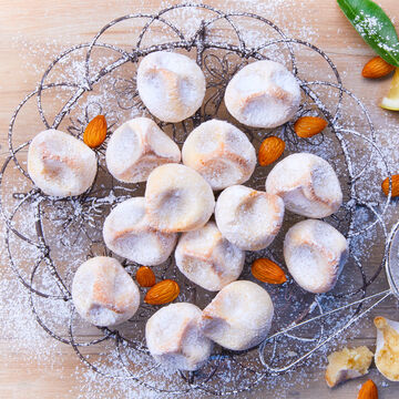 2 Tamiser le sucre glace dans un bol. Prélever des morceaux de la pâte d'amande de la taille d'une noix (20 g), les façonner en boules et les rouler dans le sucre glace. Déposer les boules sur une plaque recouverte de papier sulfurisé. Entre le pouce, l'index et le majeur, presser chaque boule par le haut pour lui donner la forme typique d'un triangle.