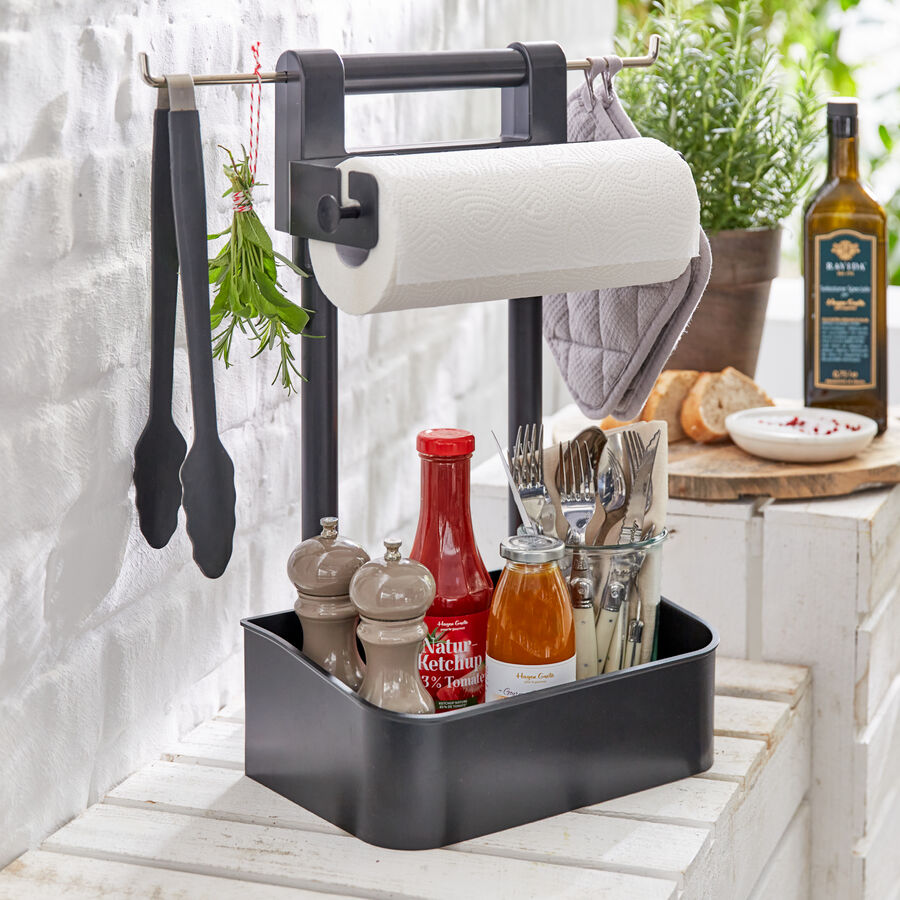 Les sauces, les épices ou les boissons ont suffisamment de place dans le grand compartiment de la boîte à accessoires barbecue. Tout y est bien rangé, toujours à portée de main, rien ne tombe pendant le transport. Support solide, porte-rouleau essuie-tout réglable en hauteur, crochets latéraux pour les ustensiles de barbecue, démontable pour gagner de la place.