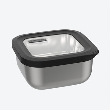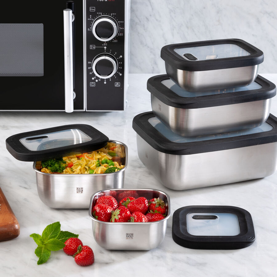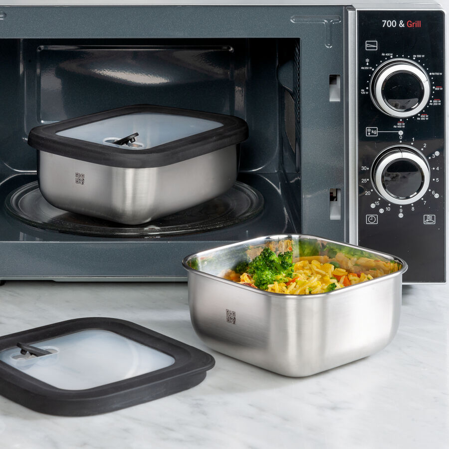 Passez les aliments du réfrigérateur directement au micro-ondes : la soupape spéciale dans le couvercle permet à la pression de la vapeur de s'échapper lors du réchauffement. Vous pouvez ainsi utiliser les boîtes en acier inoxydable dotées d'un alliage spécialement breveté dans le four à micro-ondes, même avec le couvercle. Le matériau léger et robuste résiste à des températures allant de -20 °C à 300 °C, et jusqu'à 100 °C avec le couvercle. Pour les utiliser au four, il suffit d'enlever le couvercle. Les boîtes en acier inoxydable conviennent également parfaitement comme plats à four ou à gratin. Avec deux formes différentes et trois tailles chacune, vous avez toujours la bonne boîte sous la main.