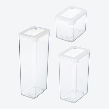 Grâce à ces récipients transparents, vous avez désormais, à tout moment, une vue d'ensemble de toutes vos réserves. Des joints spéciaux adaptés à l'alimentaire dans les couvercles également transparents, étanches à l'air et à l'eau, préservent la fraîcheur des aliments. Empilables, toutes les dimensions sont adaptées aux emballages courants ainsi qu'aux dimensions des armoires de cuisine, des tiroirs et des réfrigérateurs.