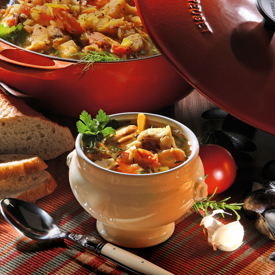 La bouillabaisse est traditionnellement servie chaude dans une soupière. Dans le Sud de la France, on garnit préalablement le fond de la soupière de petites tranches de pain blanc , qu'on a préalablement frottées à l'ail, parsemées de gouttes d'huile d'olive et légèrement faites griller au four.
