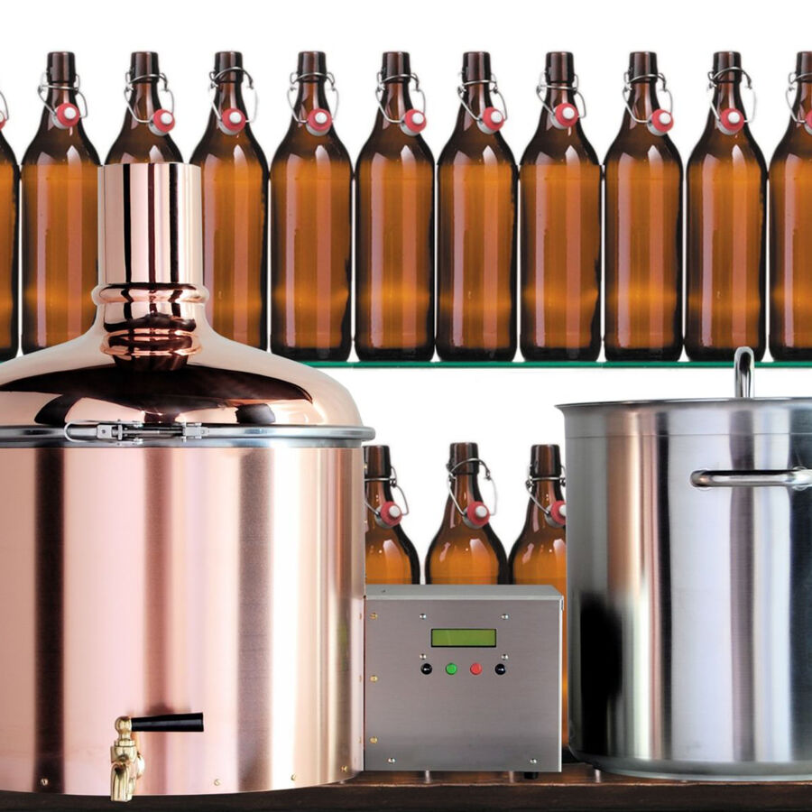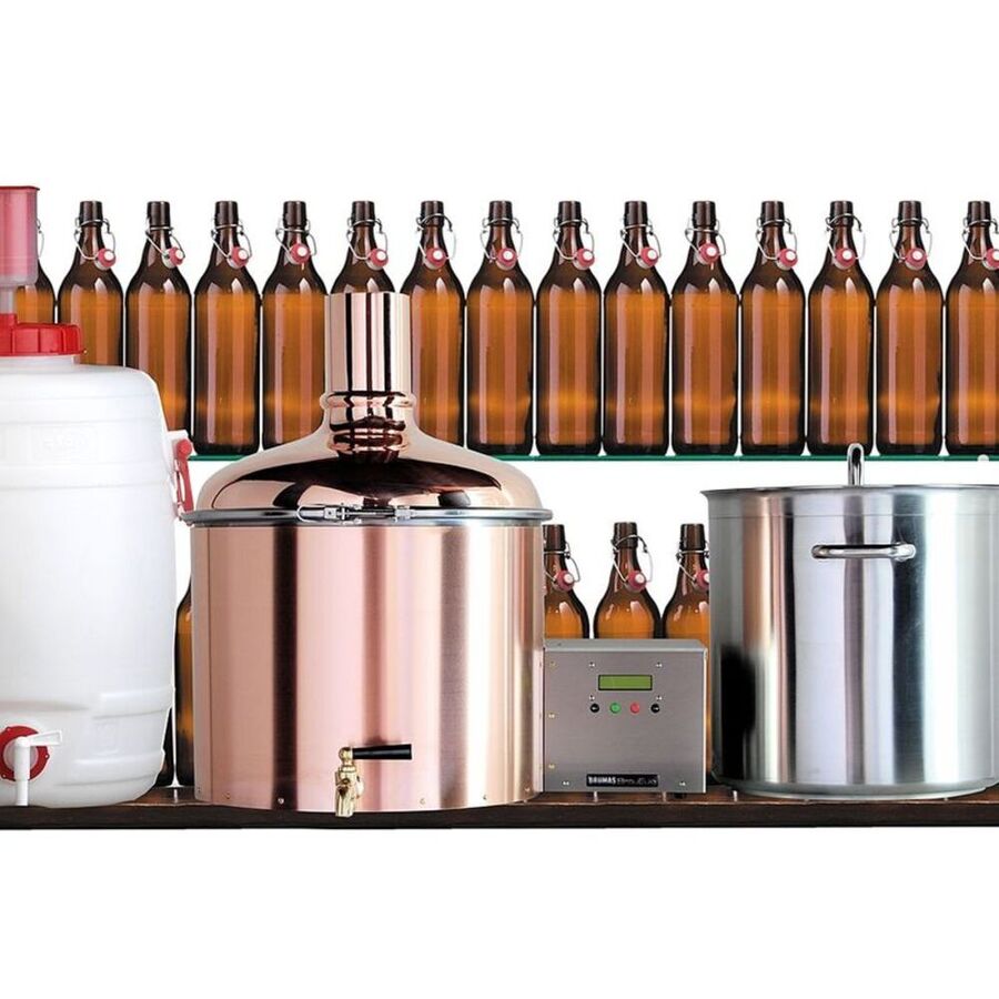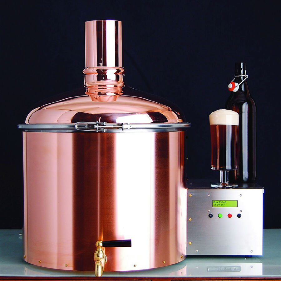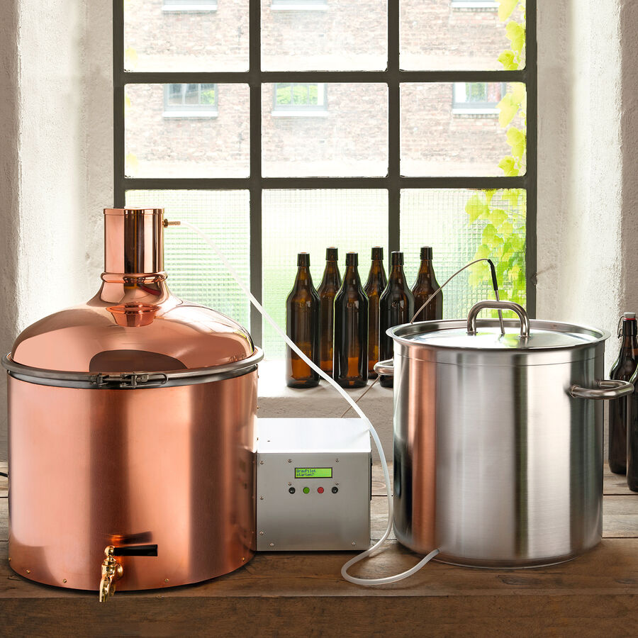 100 % adapté au contact alimentaire, chaudière à moût en cuivre, tête de cuve en acier inoxydable brossé, couvercle de sécurité env. 60 x 60 x 60 cm (hauteur), poids env. 28 kg, panneau de commande digital, réchaud extérieur (puissance de chauffage 2 kW), pompe et capteur de température, nombreux accessoires avec tonneau de fermentation de 50 l, hydromètre, cuillère en bois, kit de démarrage avec mélange de brassage pour 34 l de bière brune et 48 bouteilles à bouchon mécanique. Livré avec une notice détaillée. 230V/50Hz, 2,1 kW.