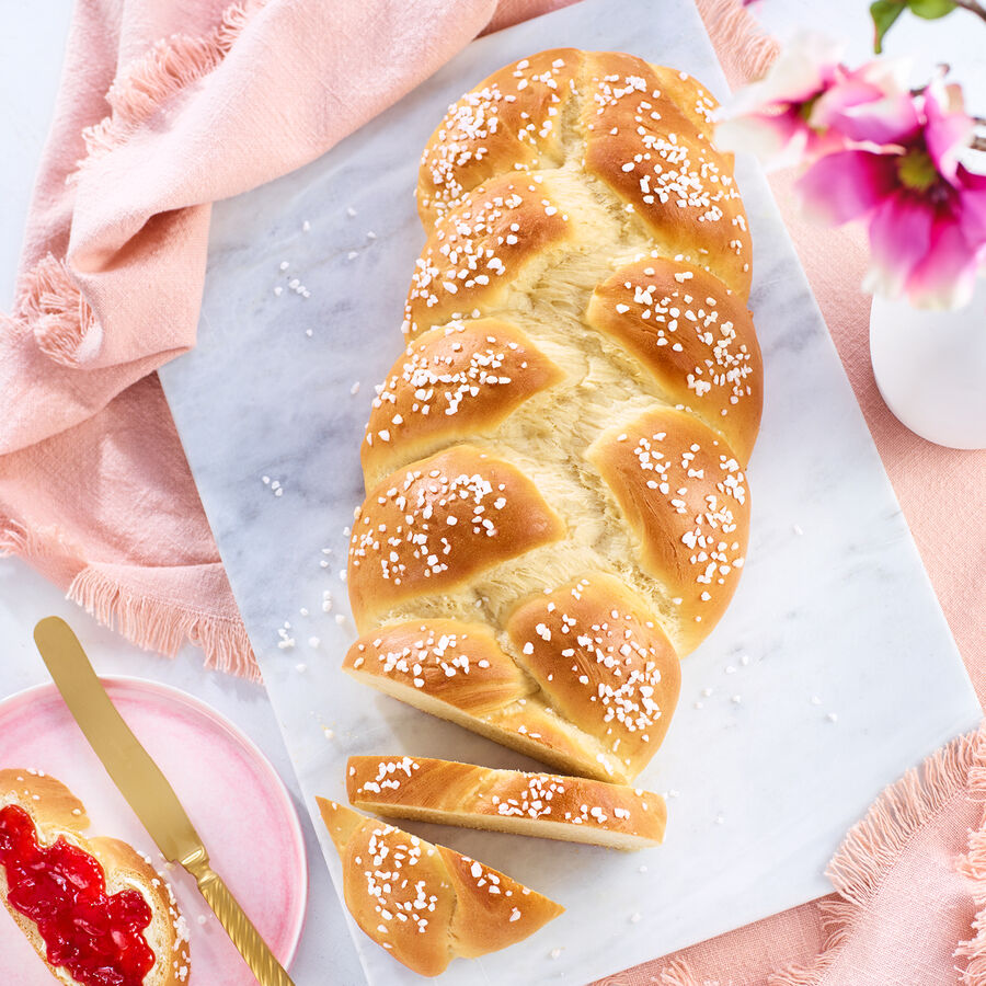 7 Badigeonner la tresse d'un peu de lait et la saupoudrer à volonté d'amandes effilées ou de sucre perlé. Cuire au four préchauffé à 180 °C (chaleur de voûte et de sole) pendant environ 20-25 minutes.