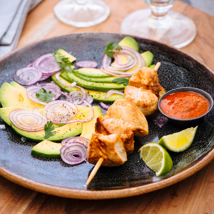 Brochettes de poulet sur avocat avec sauce salsa au piment rouge