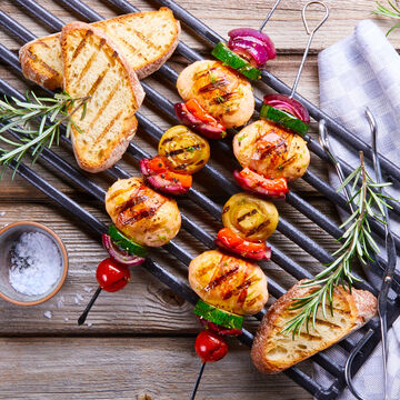 2 Badigeonner le tout avec un peu d'huile d'olive et faire griller pendant 3-4 minutes de chaque côté. Les brochettes peuvent aussi être préparées à la poêle.