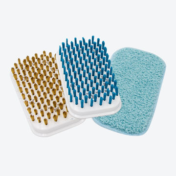 Le kit de brosses supplémentaires pour le balai vibrant 883B01 contient une brosse en nylon pour le carrelage, une brosse en laiton pour les salissures importantes à l'extérieur ainsi qu'un tampon de nettoyage supplémentaire.