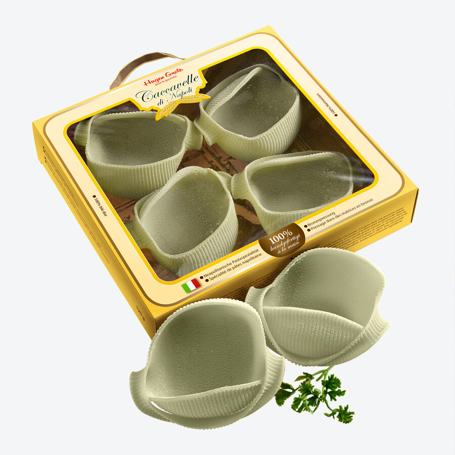Les Caccavella traditionnelles ne peuvent être fabriquées qu'à la main. La recette et le mode de production ingénieux sont transmis de père en fils depuis 200 ans dans les manufactures de pâtes. Précuire les grandes coquilles environ 20 minutes dans une eau salée. Remplir de ragoûts de viande, de légumes ou de champignons bien relevés et gratiner au four à 180 °C pendant env. 20 minutes. Une " Caccavella " délicieusement remplie est une grosse portion consistante. Fabrication artisanale, ingrédients entièrement naturels, coquille 12 x 9 x 4 cm , teneur env. 200 ml, livré avec recettes."