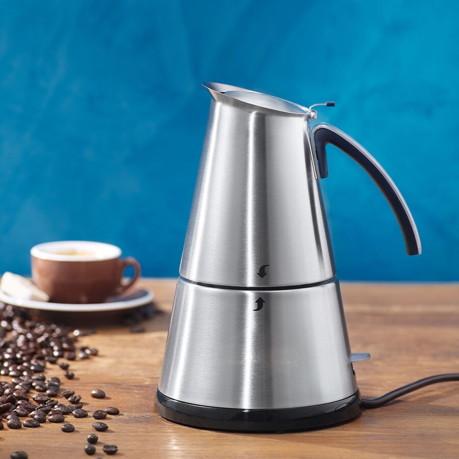 Fonctionne plus rapidement et plus proprement selon le principe éprouvé de la cafetière à expresso inventée en 1933, avec laquelle sont préparés chaque jour en Italie plus de 100 millions d'expresso, de cappuccinos, de latte macchiato. L'étonnante qualité est obtenue grâce à un ajustement optimal de la pression, du temps de préparation et de la température de l'eau. Remplir simplement la cafetière avec la quantité de café en poudre et d'eau voulue puis la placer sur sa base chauffante. En 5 minutes, l'eau bout. Dès que l'expresso est prêt, la cafetière s'arrête automatiquement. Acier inoxydable brossé mat, poignée isolée de la chaleur, interrupteur intégré, voyant de contrôle, protection contre surchauffe et fonctionnement à sec, 230V/365W, câble d'alimentation 60 cm avec dispositif d'enroulement, sécurité testée.
