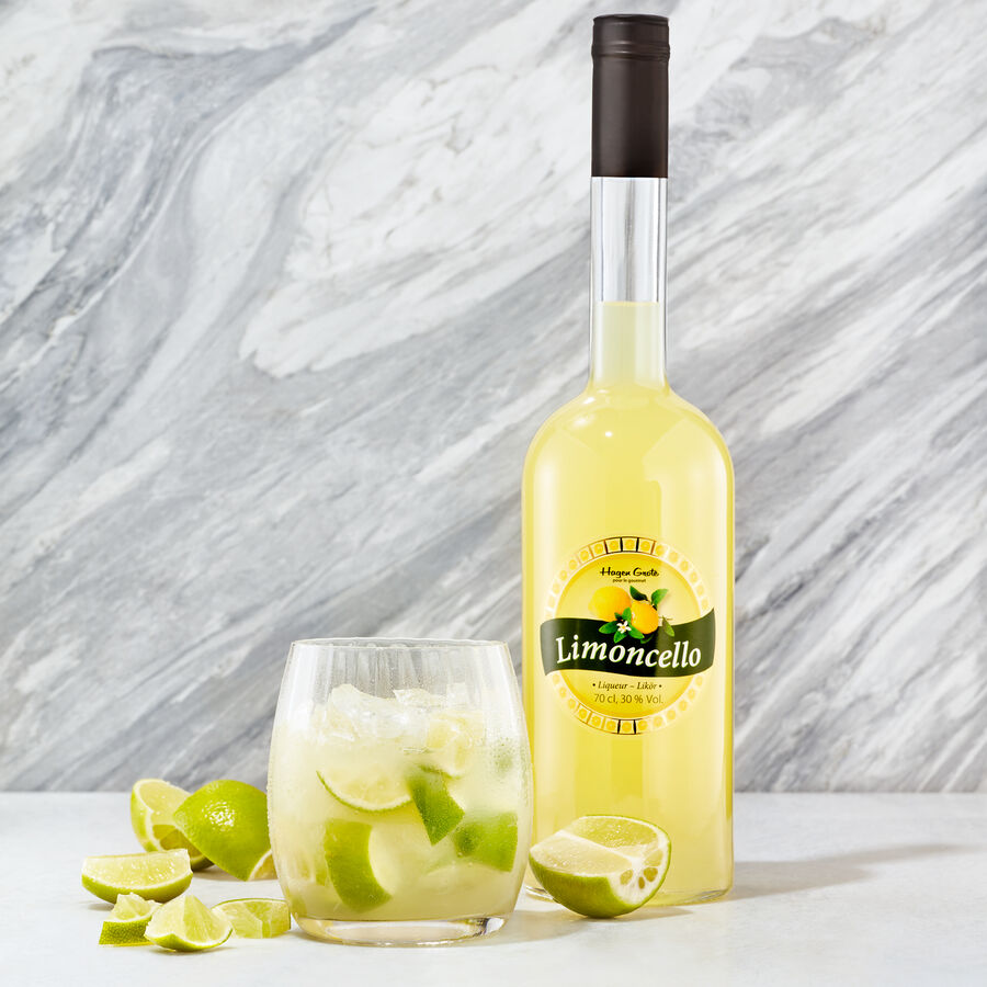 2 Écraser le citron vert et le sucre avec un pilon dans un shaker. Ajouter le rhum, le limoncello et quelques glaçons. Bien secouer et verser le tout dans un verre.