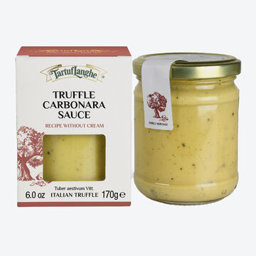 Cette sauce classique de la haute cuisine italienne des pâtes sublime également les risottos, les gnocchis et les légumes délicats. Une sauce onctueuse au fromage, préparée avec des oufs frais, du Parmigiano Reggiano et du Pecorino, délicieusement rehaussée d'une truffe parfumée (Tuber aestivum Vitt).