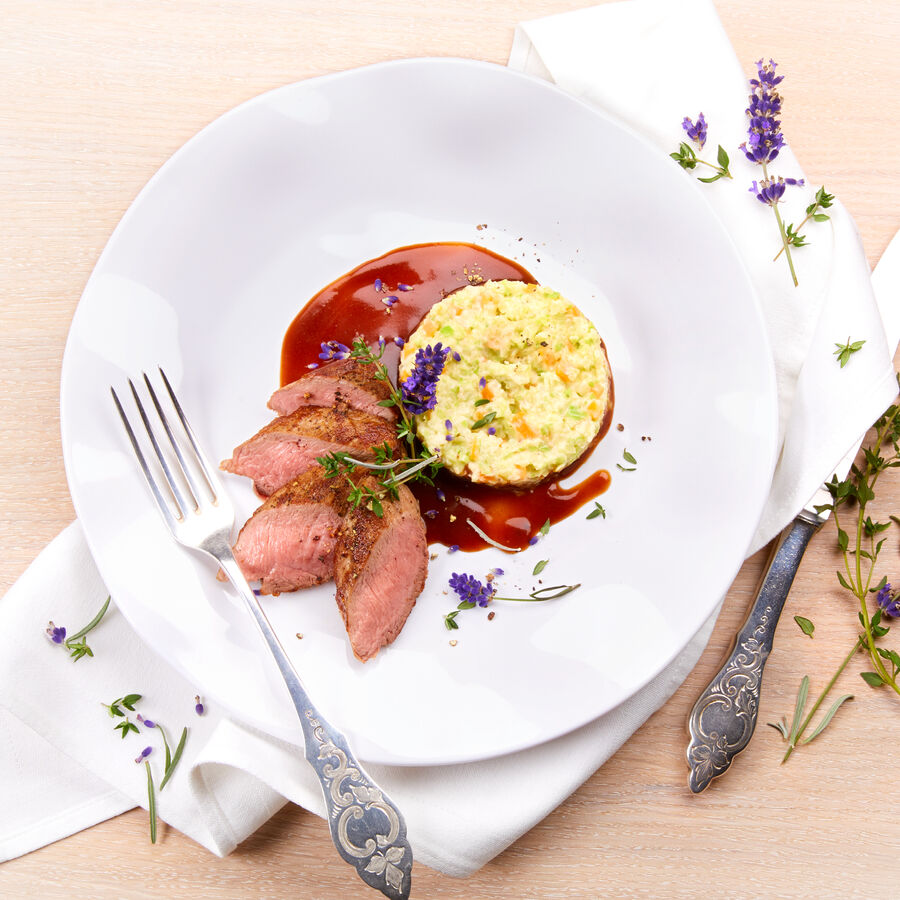 • Image du produit pour 'Carré d'agneau sur une purée de chou pointu et une sauce lavande-agneau'