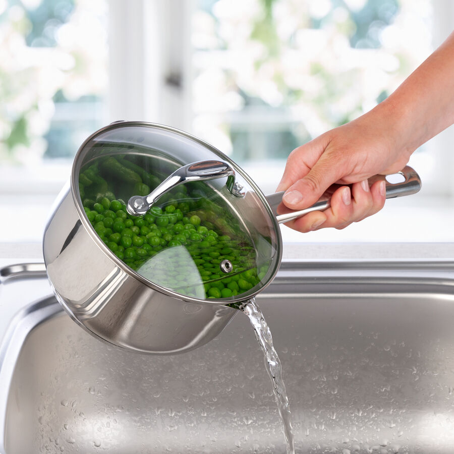Casserole saucière avec couvercle égouttoir innovant, casserole, insert passoire