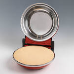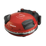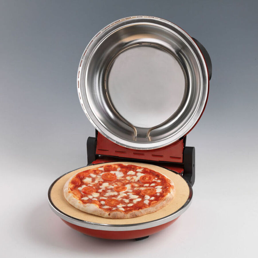 Corps en acier chromé émaillé, 33 x 35 x 20 cm (l/p/h), poids 5,4 kg, pierre de cuisson Ø 31 cm, 230V/1200W, Poignées en plastique dur à isolation thermique, pieds et poignées en plastique dur antidérapants, thermostat, réglage de température en continu, protection anti-surchauffe, minuterie, voyant lumineux, cordon de raccordement 1,05 m. Livré avec une pelle à pizza en bois.