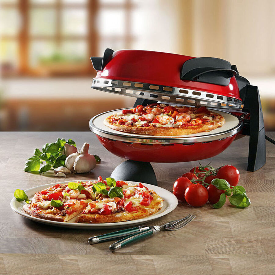 La pizza ou la calzone n'a vraiment le goût de la pizza d'Italie cuite au four en pierre que si elle est cuite très chaude (au-dessus de 350 °C) et très rapidement (maximum 5 minutes). Elle est alors croustillante à l'extérieur, la garniture merveilleusement moelleuse. Avec un volume de cuisson restreint, le cuiseur à pizza très puissant atteint en seulement 10 minutes de préchauffage les températures idéales de cuisson pour pizza jusqu'à 400 °C. La pierre de cuisson réfractaire absorbe l'humidité excédentaire de la pâte. Malgré la température élevée atteinte, le four est plus économe en énergie que tout autre four de cuisson et répond aux normes de sécurité de limites de température pour les surfaces externes.