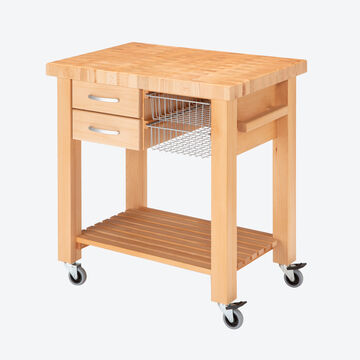 Le plan de travail de 5 cm d'épaisseur est d'une résistance indéniable grâce aux blocs de bois de hêtre coupés perpendiculairement à la fibre du bois. Ils sont collés ensemble selon différentes directions des fibres, créant avec les motifs décoratifs impressionnants, extrêmement résistants à la coupure une pièce de menuiserie de qualité. Couper, hacher, battre, rien n'a le moindre impact sur ce plan de travail. Ce matériau, préservant les précieuses lames de couteau, a un effet antibactérien. Les deux tiroirs aux assemblages classiques en queue d'aronde sont tout aussi élaborés. Avec les deux paniers coulissants en métal grillagé supplémentaires, le chariot offre beaucoup d'espace de rangement. La surface de rangement inférieure solide est idéale pour les gros appareils électroménagers et les machines de cuisine.