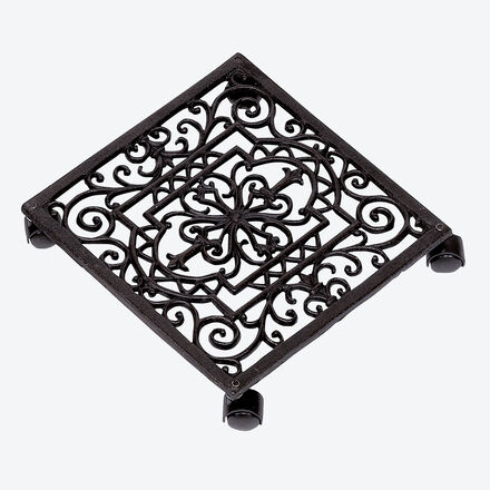 Votre chariot à roulettes décoratif en fonte rend vos lourds pots à fleurs mobiles. Ces chariots à plantes en fonte de style sont fabriqués selon une méthode artisanale séculaire. Coulés à la main, ils attirent l'attention par leur charme antique et rustique. Ils pourraient provenir directement d'un petit magasin d'antiquités de la Portobello Road à Londres. Vous déplacez sans peine de l'intérieur vers l'extérieur les plantes en bac pesant jusqu'à 90 kg sur ces roues en plastique stables et manoeuvrables. Ne sont pas inoxydables. Même lors du nettoyage, les plantes sont rapidement mises de côté sans abîmer vos précieux sols. 4,5 cm haut, pèse 2,2 kg.