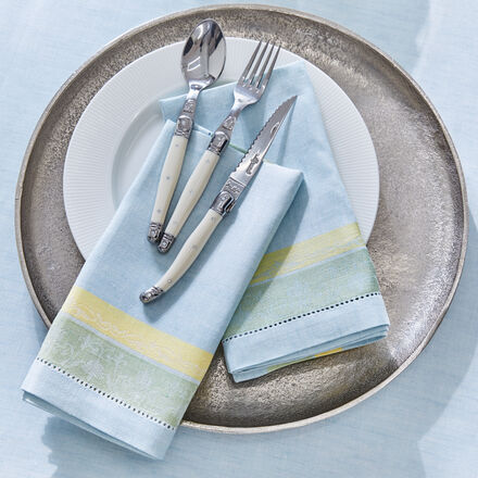 Des motifs de Pâques peints à la main au XIXe siècle constituent le motif de ces serviettes de table en lin de très haute qualité. Elles sont tissées sur des métiers à tisser historiques avec de vieilles cartes perforées jacquard. Des fleurs printanières, des papillons et des lapins dans des tons pastel, ainsi que la surface naturellement brillante et irisée, confèrent un aspect luxueux et une charmante légèreté.
