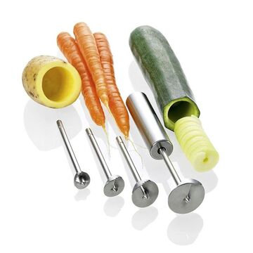 Cet ingénieux set 2 en 1 transforme les fruits et légumes fermes en spirales décoratives tout en les évidant en douceur - parfait pour des garnitures raffinées, des snacks sains ou des créations culinaires originales. Grâce aux quatre embouts fournis (Ø 1,6 / 2,3 / 2,9 / 3,9 cm), vous pouvez adapter la découpe à la taille de vos ingrédients et à vos recettes. Courgettes, carottes, pommes ou radis se creusent facilement et proprement. Le mécanisme de fermeture assure une prise en main sécurisée et un changement rapide des embouts. Un véritable outil multifonction pour une cuisine moderne, saine et inventive – idéal pour les recettes low-carb, les légumes farcis ou les tagliatelles de légumes.