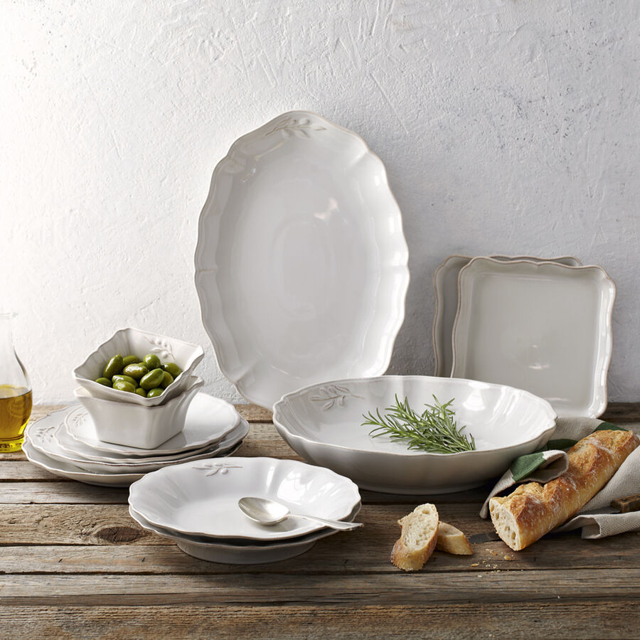 L'olivier a toujours été un symbole particulier de l'univers culinaire de la région méditerranéenne. Ses feuilles et ses fruits ornent le bord, délicatement travaillé en relief, de cette vaisselle très classe. Avec une élégance charmante, elle transmet un style de vie de haut niveau. Les bords de la vaisselle ont été traités au cours d'un travail manuel sophistiqué pour obtenir le bel effet patiné. La cuisson à presque 1200 °C rend la vaisselle en faïence haut de gamme, recouverte d'un verni pour contact alimentaire, résistante à une température de -20 °C à + 250 °C, adaptée au micro-ondes et au lave-vaisselle.