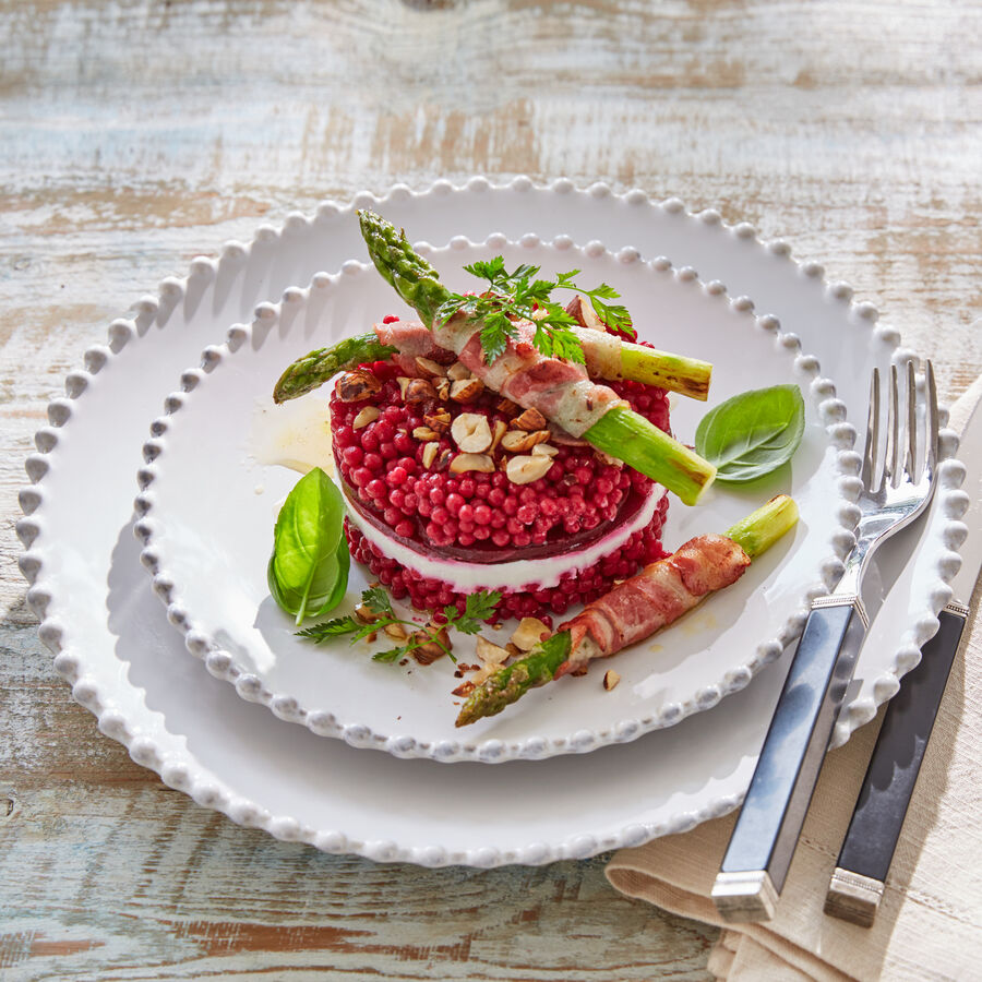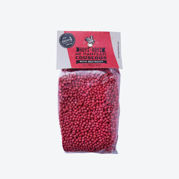 C'est dans une manufacture alimentaire grecque que cette spécialité de couscous perlé unique voit le jour. Les grosses boules de blé dur prennent une coloration impressionnante et entièrement naturelle grâce au jus de betterave rouge. Le couscous enrichira les plats de viande, de poisson et de légumes. D'un point de vue gustatif et visuel, il fera sensation avec les asperges vertes ou en taboulé.