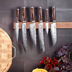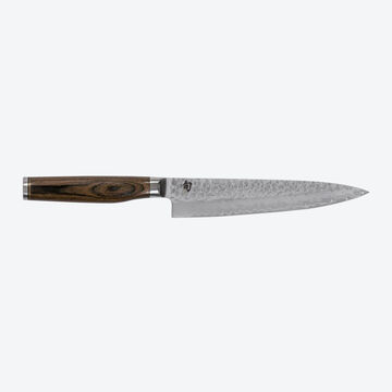 Les lames de la série Shun Premier ont été spécialement développées pour les besoins et les exigences des chefs professionnels. La série premium portant le nom du célèbre chef allemand allie les propriétés de haute qualité des matériaux de la série Shun Classic à une surface martelée à la main, également appelée Tsuchime au Japon. Cela donne aux couteaux Shun Premier Tim Mälzer non seulement un look complètement novateur, mais présente également l'avantage de créer des coussins d'air fins lors de la coupe, qui empêchent les aliments coupés d'adhérer autant que possible. Les couteaux utilitaires sont les couteaux les plus utilisés en raison de leur polyvalence. La lame de 16,5 cm de long du Kai Shun Premier coupe rapidement et avec précision oignons, ail, champignons et petits morceaux de viande. L'épluchage des fruits et légumes se fait également en un rien de temps Le coeur du couteau est en acier VG MAX extrêmement dur et résistant à la corrosion, d'une dureté de 61 (± 1) HRC. Il est entouré de 32 couches d'acier Damas, ce qui confère au couteau une incomparable anatomie à la fois dure et élastique.. La lame biface est agréable à manipuler en raison de son faible poids et garantit une coupe nette et précise. Les poignées en noyer résistant, finement laminées et parfaitement approuvées par la gastronomie, répondent parfaitement aux normes d'hygiène les plus strictes. La répartition équilibrée du poids permet des mouvements légers et fluides et un travail sans fatigue.